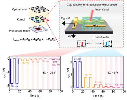 (그림1) 1D Nb2Pd3Se8/ 2D WSe2 이종접합 광검출기의 게이트 조절형 전류 방향 전환. 게이트 전압 변화에 따라 양·음 광전류가 전환되며, 인센서 이미지 처리에 활용 가능한 양방향 광응답을 보여줌.