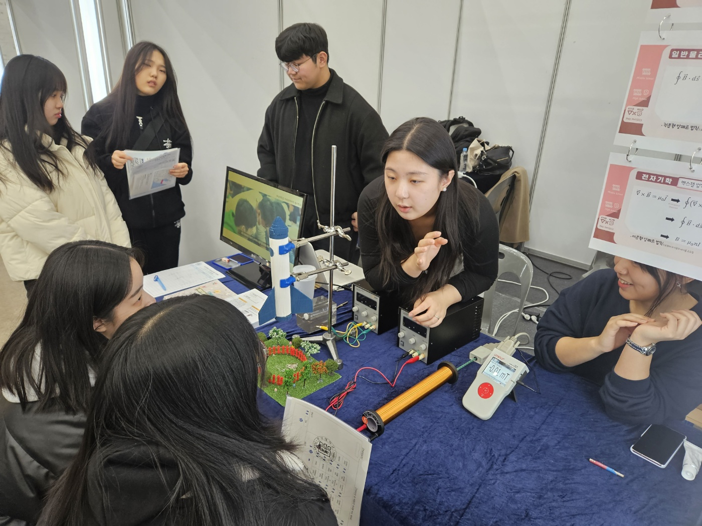 부산대학교 물리학과에서는 제29회 물리 오픈랩을 맞아, 많은분들과 함께 과학의 즐거움을 나누는 뜻깊은 시간을 가졌습니다. 바쁘신 와중에도 오픈랩에 방문해주시고, 열정적으로 참여해주신 초·중·고등학생 및 시민 여러분께 진심으로 감사드립니다. 이번 행사는 물리학의 원리를 쉽고 재미있게 접할수 있도록, 우리 학과 학부생들이 직접 실험을 준비하고 안내하는 체험 중심의 프로그램으로 꾸며졌습니다. 일시 : 2025년 5월 16일(금) ~ 5월 17일(토)장소 : 부산대학교제2물리관 개회식에서 따뜻한 격려의 말씀을 전하시는 물리학과학과장님 개회 인사 후, 이번오픈랩을 함께 만들어간참가자, 학부생 운영진, 교수님들 모두가 함께 모여 단체사진을 촬영하였습니다.다양한 세대가 한자리에 모여 과학의 즐거움을 나누는이 자리는물리학과 커뮤니티의 따뜻한 연대감을 잘 보여주었습니다. 본격적인 실험 체험은 제2물리관 1층105호에서 시작되었습니다.참가자들은 각 실험실을 돌며, 물리학과와 물리교육과 학부생들이 직접 준비한다양한 실험 시연과 참여형 프로그램에 참여하였습니다.105호 → 212호 → 301호 → 307호 → 407호로이어지는 동선에 따라총 20여 개의 실험이 준비되어 있었고, 각공간은 학생들의 호기심과 열기로 가득 찼습니다.그 생생했던 현장을 사진과 함께 살펴보시죠! 제2물리관 1층 105호에서는 물리학의 역학적 원리를 생생하게 느낄 수 있는다양한 시연과 체험 프로그램이 진행되었습니다.우주 탐사선의 궤도 설계에 활용되는 스윙바이 효과 시연부터,실제처럼 움직이는 자기부상열차 시연,회전계에서의 힘을 체감할 수 있는 코리올리 힘 체험,그리고 관성의 법칙을 응용한 로봇조의 시연까지,참가자들은 단순한 설명을 넘어서, 직접 눈으로 보고 손으로 체험하며역학과 운동에 대한 직관을 키워볼 수 있는 시간을 가졌습니다. 105호에서의흥미로운 체험을 마친 참가자들은 제2물리관 2층, 212호 실험실로 이동했습니다.이곳에서는 보다 정밀하고 깊이 있는 물리 현상을주제로 한 체험들이 준비되어 있었습니다.이제 212호에서어떤 실험이 기다리고 있었는지 함께 살펴보시죠! 2층 212호 실험실에서는 파동, 광학, 양자역학, 유체역학 등폭넓은 주제를 다룬 실험들이 진행되었습니다.먼저, 공명을 이용한 정상파와 클라드니 무늬 실험에서는음파에 의해 진동판 위의 모래가 일정한 무늬를 형성하는 과정을 통해정상파와 공명의 개념을 시각적으로 확인할 수 있었습니다.이어지는 편광 관련 체험에서는,빛의 편광 성질을 활용한 마술상자와 편광 선글라스 실험이 준비되어 있었습니다.편광 필터의 배열에 따라 시야가 달라지는 현상을 관찰하며,편광이 실생활에서 어떻게 활용되는지를 이해할 수 있도록 구성되었습니다.광활성 물질 체험에서는 물엿이담긴 시약병을 통해,광학 활성도가 각도에 따라 빛의 색을 어떻게 변화시키는지를 살펴볼 수 있었습니다.보다 심화된 내용으로는 양자 알고리즘 기계 시연이 진행되었습니다.고전적인 역학 장치를 활용해 양자 알고리즘의 병렬성과 중첩 개념을 설명하며,양자컴퓨터가 기존 컴퓨터와 어떻게 다른지를 소개하는 교육적 목적의 실험이었습니다.마지막으로, 마그누스 효과 시연 및 체험에서는회전하는 물체가 유체 내에서 어떤 방향으로 힘을 받는지를 직접 실험을 통해 확인할 수 있었습니다. 행사를 성공적으로 마무리한 후, 학부생 운영진과 교수님들이 다시 한자리에 모여 마지막 단체사진을 남겼습니다.앞으로도 부산대학교 물리학과는더 많은 분들과 과학의 감동을 나누는 자리를 마련해 나가겠습니다.내년 제30회를 기약하며, 다시 한 번 제29회 물리 오픈랩에 함께해주신 모든 분들께 진심으로 감사드립니다.